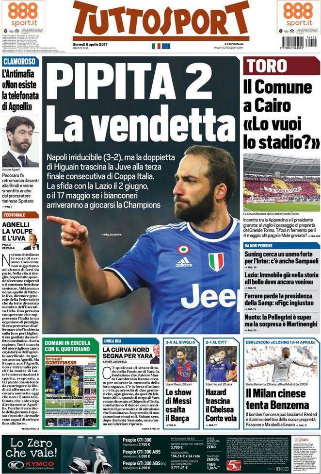Tuttosport apre parlando della semifinale di Coppa Italia che ha visto la vendetta di Higuain contro De Laurentiis. Spazio anche agli ultimi sviluppi sul caso Mafia – Agnelli e agli ultimi candidati per la panchina nerazzurra, con Suning alla ricerca di una guida volitiva. Infine la possibilità di vedere Benzema al Milan.