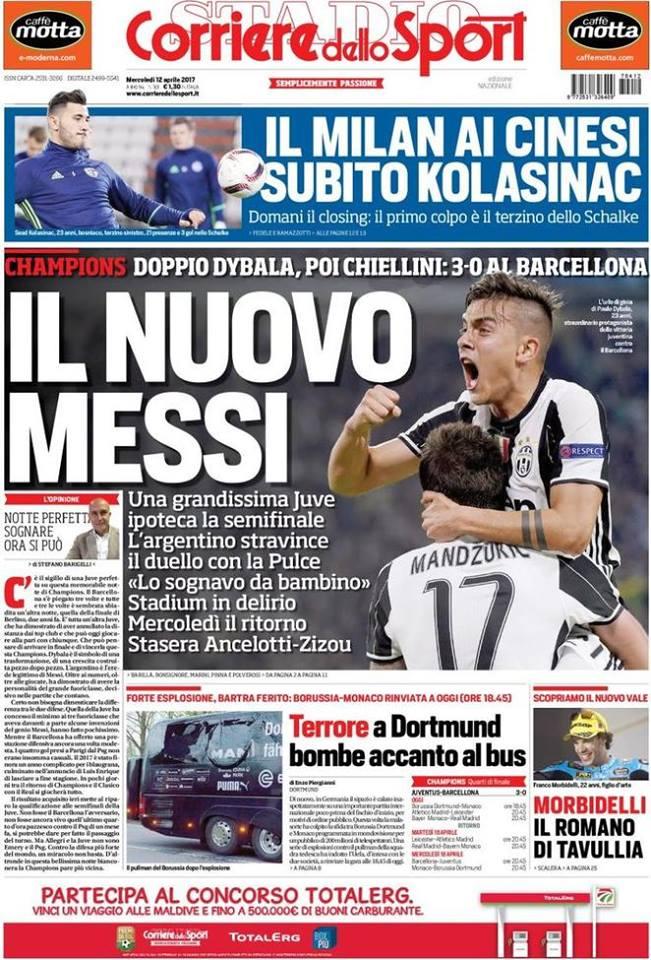 L’edizione odierna di TuttoSport concentra ovviamente la prima pagina su Dybala e sulla vittoria per 3-0 sul Barcellona nei quarti di finale di Champions League. Lo stesso Il Corriere dello Sport, che addita Dybala come “il nuovo Messi”.
