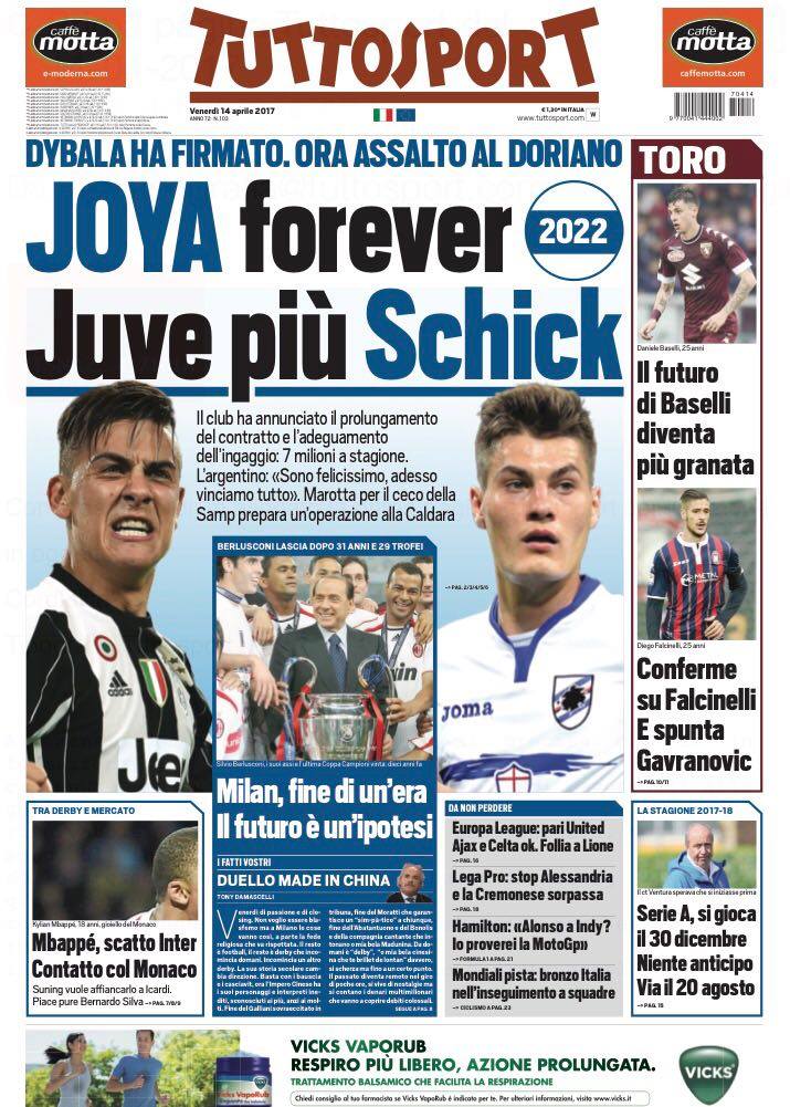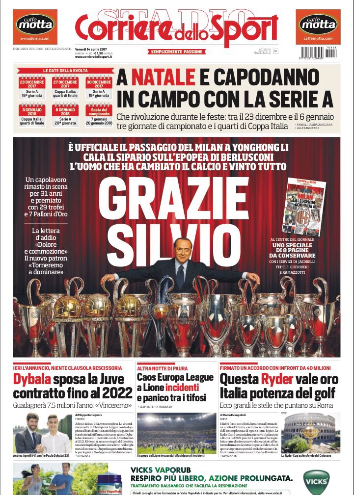 Nessuna traccia di Inter invece sulla prima pagina del Corriere dello Sport, dedicata in buona parte a Silvio Berlusconi che lascia la presidenza del Milan. Spazio anche a Dybala pronto a rinnovare con la Juventus fino al 2022 e al nuovo calendario per la prossima stagione.