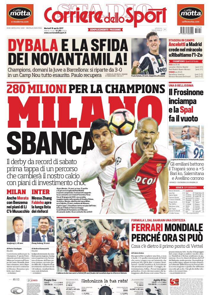 Il Corriere dello Sport invece punta forte sul mercato delle due milanesi, con le proprietà cinesi intenzionate a fare grandi cose. L’Inter in particolar modo sembra voler puntare su Fabinho, mentre per i rossoneri si fanno i nomi di Morata, Benzema e Musacchio. Spazio ovviamente anche alla sfida di Champions League tra Juventus e Barcellona.