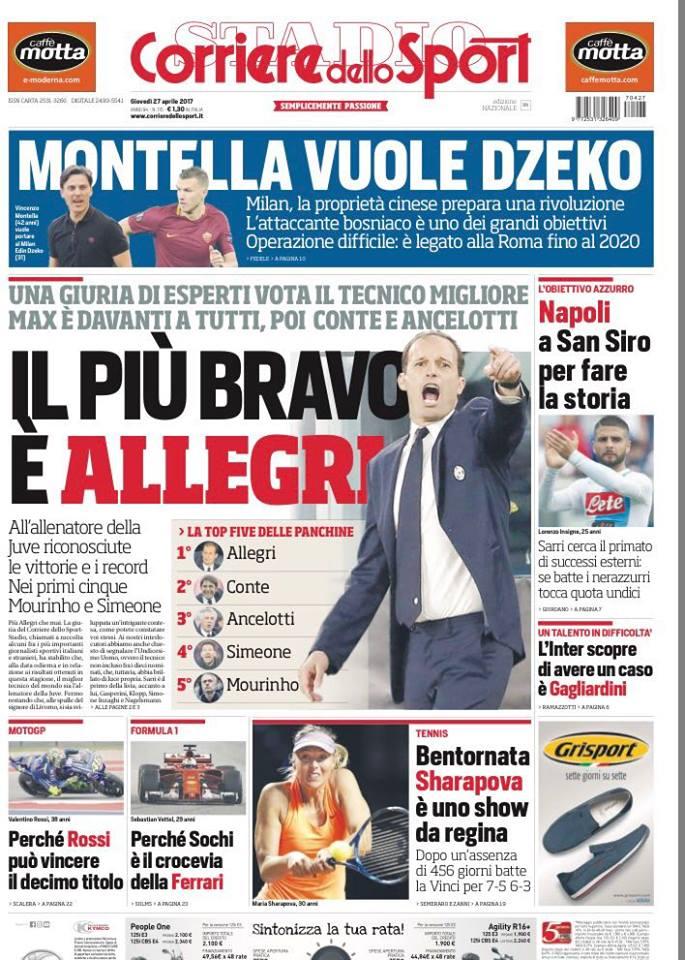 Il Corriere dello Sport invece apre parlando di Allegri, votato migliore allenatore da una giuria di esperti. Spazio anche al mercato, con il Milan pronto a cercare di strappare alla Roma Dzeko e con l’Inter alle prese con un presunto (molto presunto) caso Gagliardini.