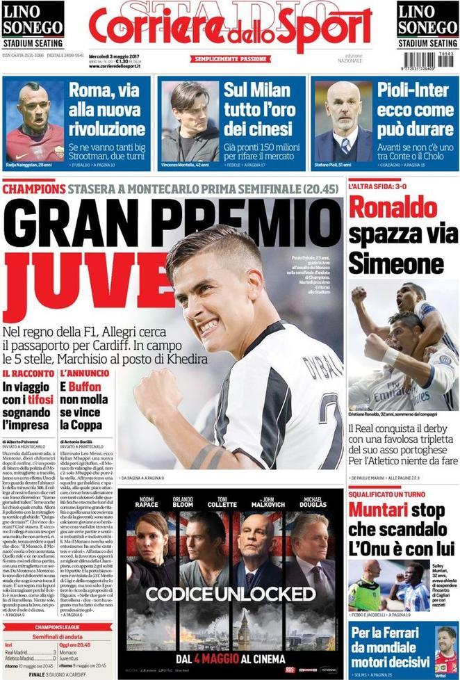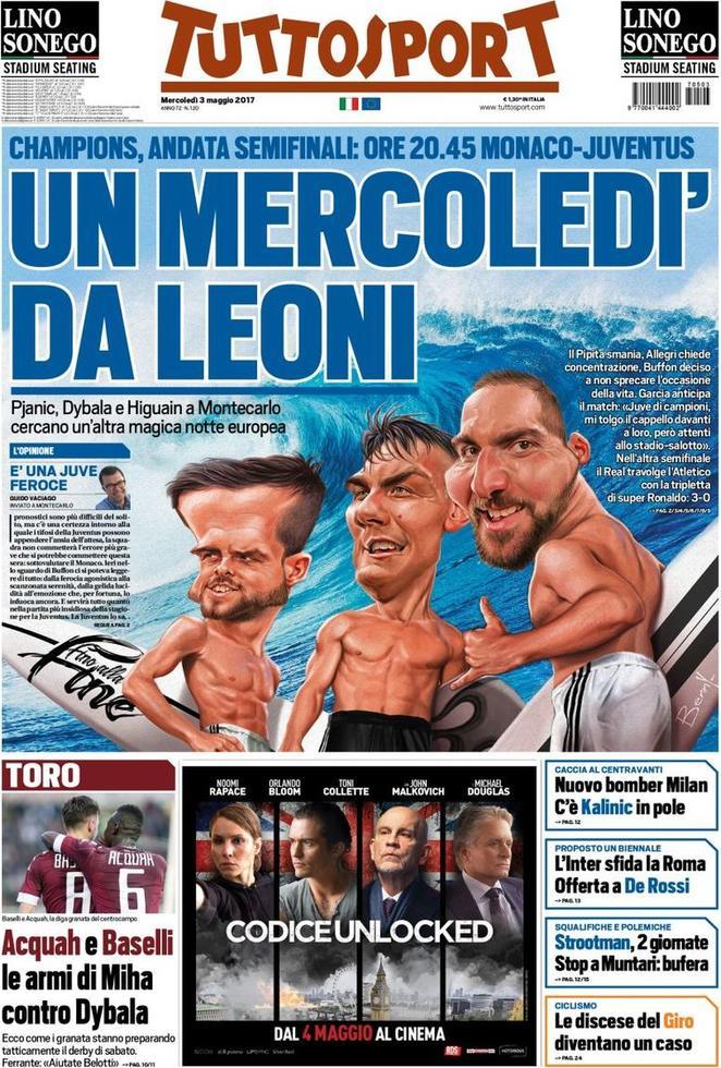 Un mercoledì da leoni titola TuttoSport. Un mercoledì che prevede la grande sfida a Montecarlo tra Juventus e Monaco. Dunque è l’argomento del giorno e le prime pagine presentano questa sfida importante per tutti, e non solo i bianconeri. Notizie nerazzurre sono comunque presenti: nel dettaglio, si parla della possibilità di vedere De Rossi (bandiera giallorossa) indossare la casacca nerazzurra.
