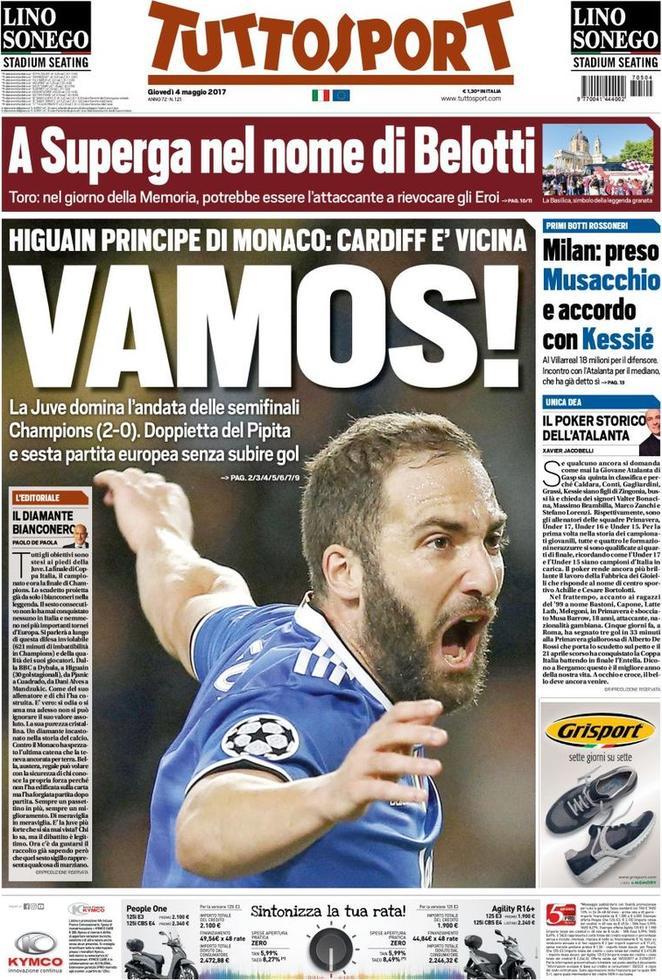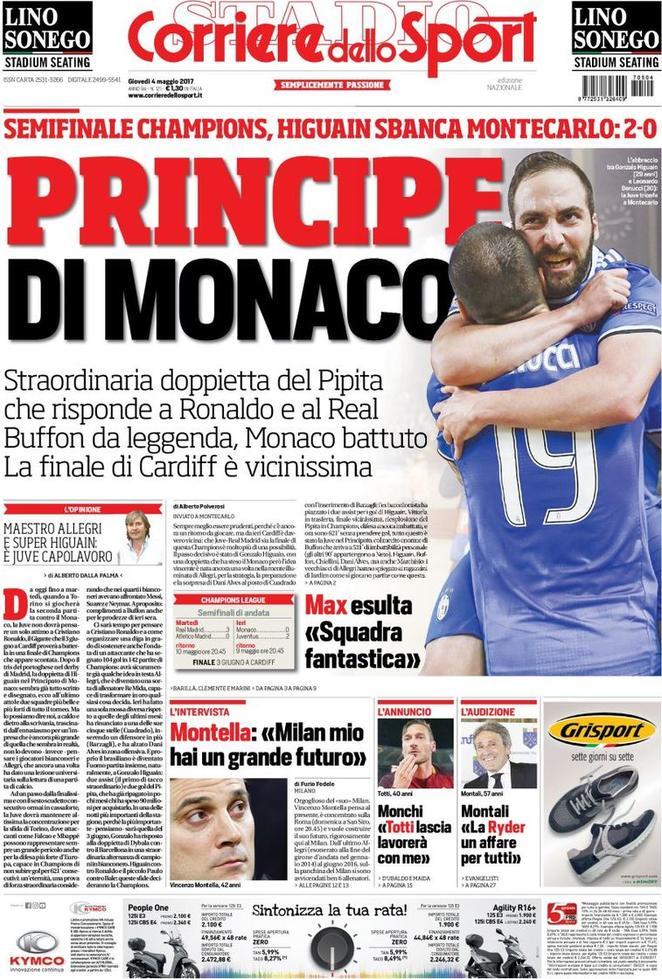 Nella prima pagina di Tuttosport non c’è alcun riferimento ai nerazzurri. L’attenzione è concentrata quasi interamente sul match di Champions League che ha visto vincere la Juventus a Monaco. Una notizia di mercato che riguarda relativamente i nerazzurri, però, è il mercato del Milan: i rossoneri, infatti, oltre ad aver preso Musacchio avrebbero trovato anch eun accordo con Kessiè. Anche il Corriere dello Sport non menziona i nerazzurri, regalando la prima pagina ai bianconeri e ad Higuain. Sempre riguardo i rossoneri, si accenna alla voglia del tecnico Montella di fare grande il suo Milan.