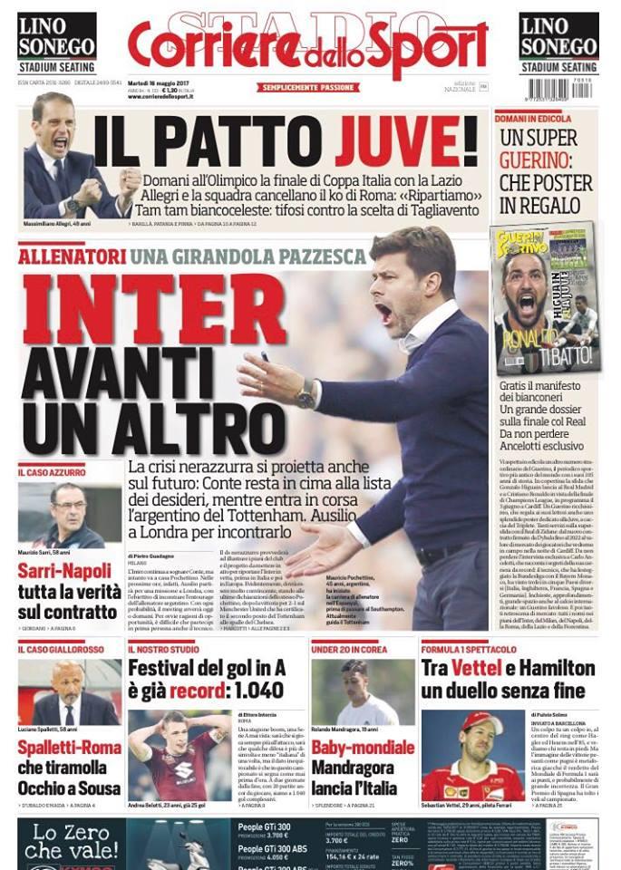 Il Corriere dello Sport apre parlando del toto allenatori nerazzurro e del caos sulla panchina giallorossa e del Napoli. Spazio anche alla Juventus ed al “patto” stipulato da Allegri per raggiungere il triplete.