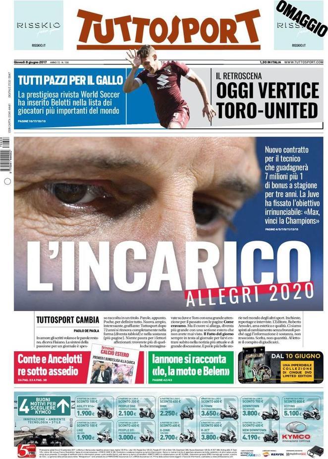 Prima pagina del quotidiano torinese dedicata al rinnovo del tecncio bianconero. Max Allegri percepirà ben 7 milioni all’anno, più un altro di bonus. In taglio alto il gallo Belotti. L’attaccante granata è stato posto dalla rivista World Soccer trai più importanti giocatori del mondo. In taglio basso Conte ed Ancellotti, re sotto assedio, e Iannone. Il motociclista si racconta tra moto e Belen.