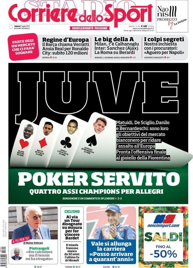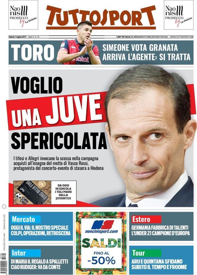 Nella rassegna stampa di oggi, il Corriere dello Sport parla di un possibile acquisto per l’Inter. Tra i nomi, infatti, c’è quello di Sanchez dell’Ajax. I lancieri hanno già rifiutato una prima offerta dell’Arsenal: serviranno 45 milioni per assicurarselo. Tuttosport, invece, continua ad accostare il nome di Angel Di Maria ai nerazzurri. L’argentino, di proprietà del Paris Saint Germain, sarà il primo regalo a Luciano Spalletti come inizio di un mercato finalmente libero dai vincoli del Fair Play Finanziario. Per un possibile acquisto che arriva, ce n’è uno pronto a sfumare: la Roma, dopo aver rinunciato a cedere Manolas allo Zenit, punta a vendere Antonio Rudiger. Il tedesco, però, non andrà l’Inter, ma al Chelsea. Antonio Conte, infatti, è pronto a mettere sul piatto almeno 35 milioni per il centrale. I giallorossi, però, ne chiedono 40.