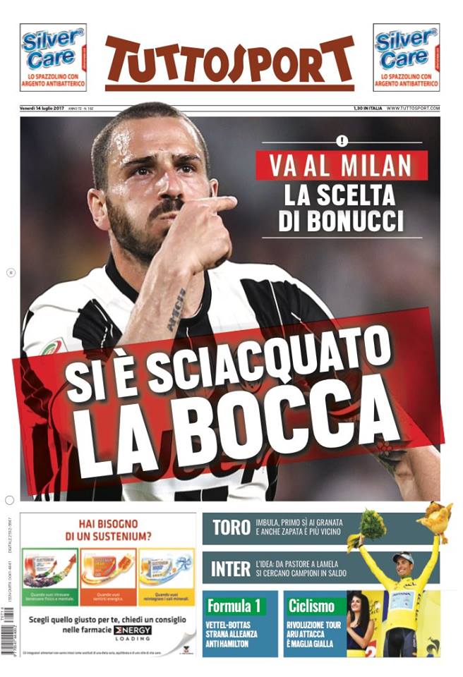 Prima pagina ovviamente dedicata al colpaccio del Milan. I cugini rossoneri hanno strappato alla Juventus Leonardo Bonucci. Cifre ancora da definire, ma sicuramente questo sarà uno dei migliori colpi dell’estate. Ancora mercato: Torino è fatta per Imbula. L’ex obiettivo dell’Inter è vicinissimo ai granata. Vicino al trasferimento sotto la Mole anche Zapata. Inter invece che punta ai campioni in saldo. Con alcuni anni di ritardo Lamela potrebbe arrivare ad Appiano. Infine spazio a F1 e Ciclismo. Bottas e Vettel formano un alleanza anti Lewis Hamilton, mentre Fabio Aru attacca e diventa la nuova maglia gialla del Tour de France.