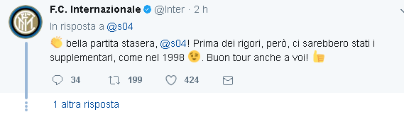 I tedeschi avevano iniziatosin da ieri, rispondendo ad un twwt dell’inter ricordando il 2-5 patito in Champions ai quarti. Nel post partita hanno ripreso a ricordare il passato twittando: “Peccato non sia finita ai rigori come nel 1997”. Facendo riferimento alla sconfitta patita ai rigori in finale di Coppa Uefa. Inter che questa volta non si è fatta cogliere impreparata ma che ha prontamente risposto: “Prima dei rigori ci sono i supplementari, e sarebbe finita come nel 1998″. Riferimento questo ai quarti di Coppa Uefa dove l’Inter sconfisse i nerazzurri per 2-1 dai nerazurri proprio ai supplementari.