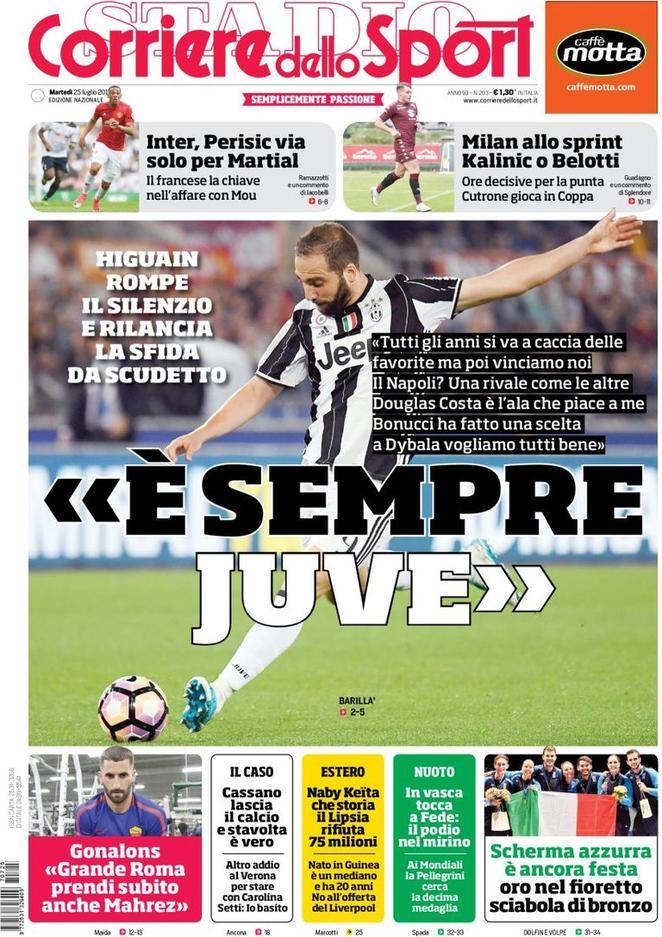 Il Corriere dello Sport apre parlando di Higuain che è molto carico per la prossima stagione e non teme rivali, perlomeno in Italia. Spazio poi all’Inter, che cederà Perisic solo in cambio del gioiellino francese Martial. Citazione anche per il mercato del Milan, sempre alla ricerca di una punta di peso, e per Cassano, che si è ritirato definitivamente dal calcio giocato.