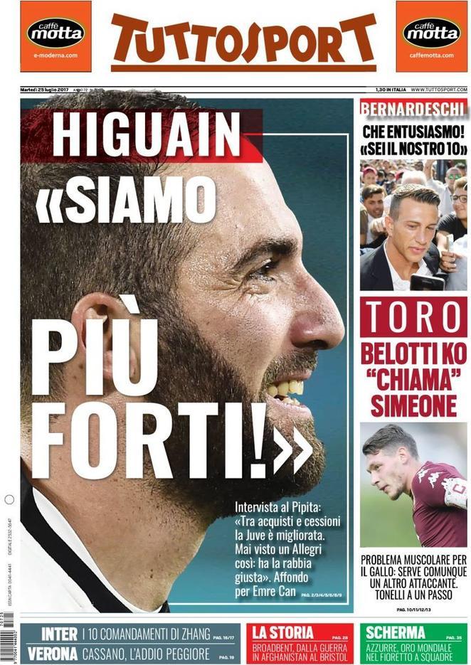 TuttoSport apre parlando a sua volta di Juventus e di Higuain, che sfida tutti gli inseguitori. Spazio anche all’ufficializzazione di Bernardeschi per i bianconeri ed ai “dieci comandamenti” dettati da Zhang Jindong per rifare grande l’Inter.