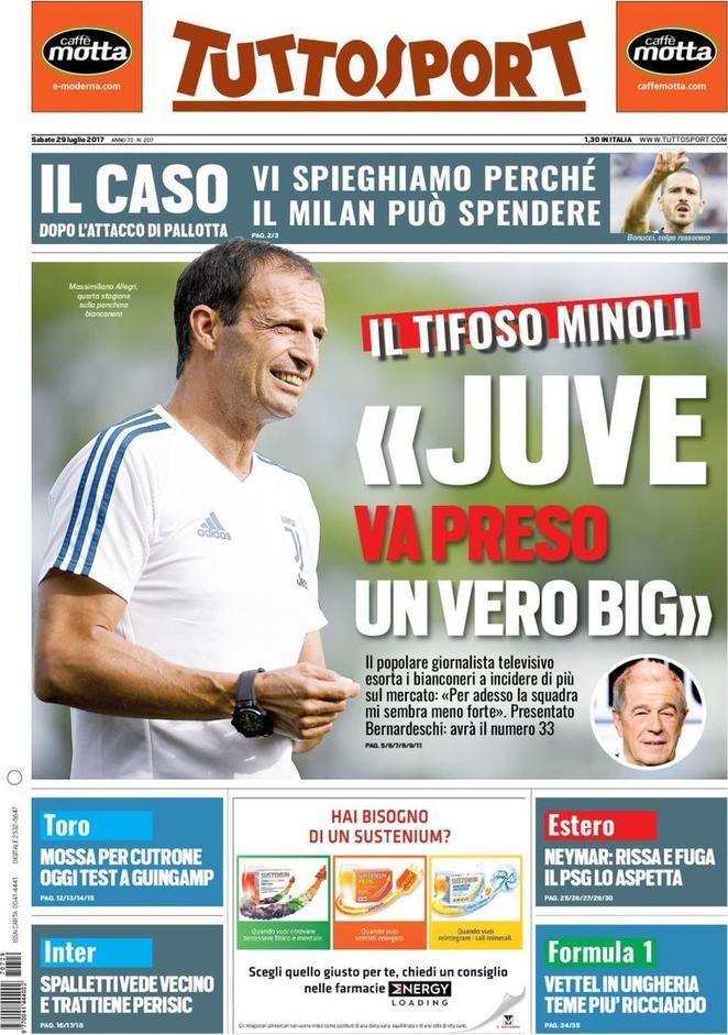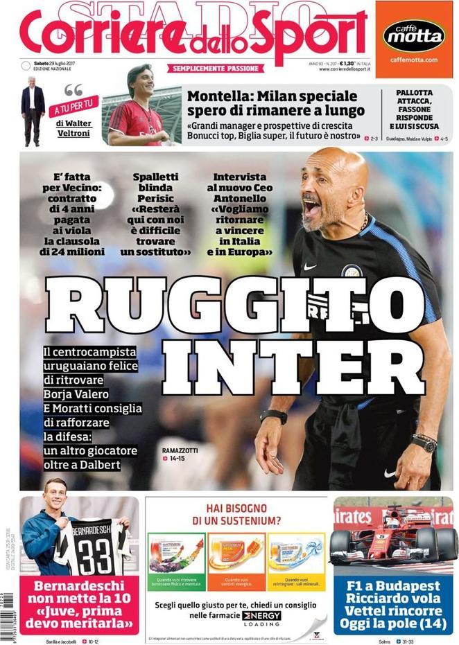 Nella prima pagina del Corriere dello Sport, a dominare è l’Inter. I nerazzurri, infatti, hanno blindato Vecino, che arriverà la prossima settimana. Tramite Spalletti, inoltre, la società ha comunicato di non voler vedere Ivan Perisic. Inoltre, Moratti consiglia un altro difensore, oltre a Henrique Dalbert, in arrivo dal Nizza. Presente anche un’intervista al nuovo Ceo, Antonello, che afferma di voler riportare l’Inter sul tetto d’Italia e d’Europa. Concetto ribadito anche da Tuttosport, che sottolinea la voglia nerazzurra di tenere il suo big, inizialmente destinato al Manchester United. Conferme anche sull’approdo a Milano di Matias Vecino, pronto a sostenere le visite mediche e firmare il contratto.