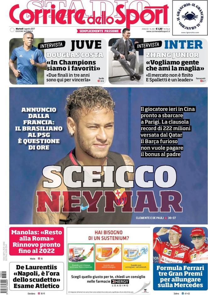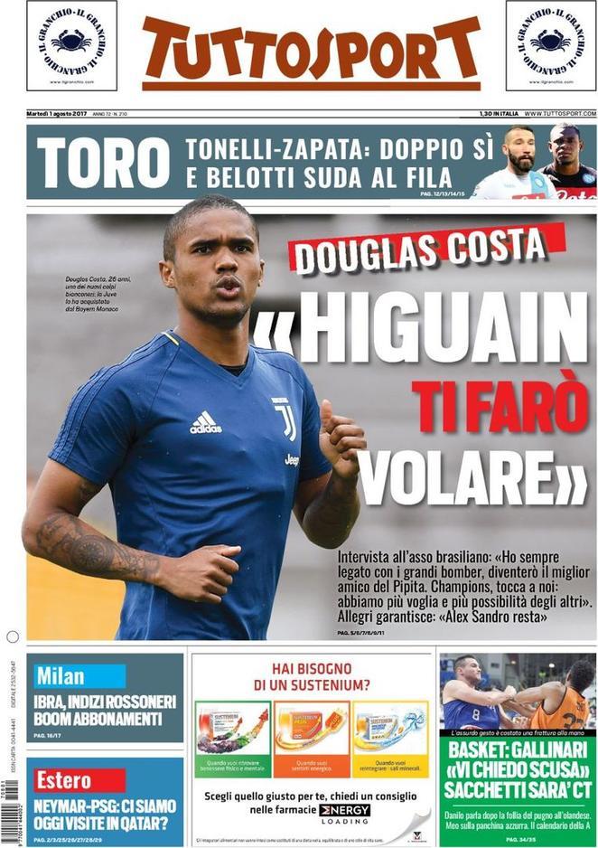 La prima pagina dell’edizione odierna di TuttoSport si concentra su un’intervista al nuovo giocatore bianconero Douglas Costa. Il Corriere dello Sport invece presenta un’intervista a Zhang Jr. intervenuto su Inter, Spalletti e mercato.