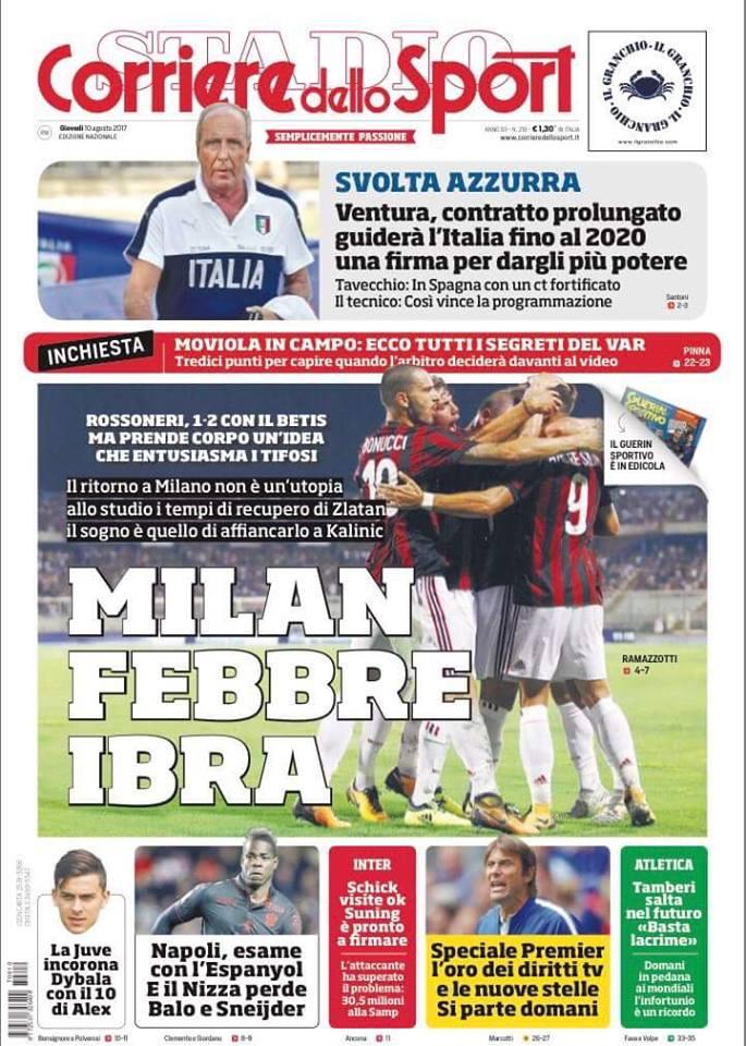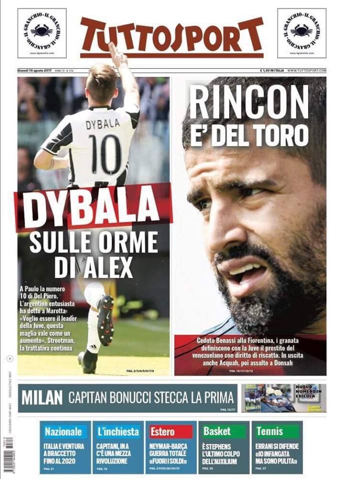 Il Corriere dello Sport si concentra sull’Inter sempre più vicina a Schick, che ha superato i nuovi test medici. TuttoSport invece mette in evidenza in prima pagina Dybala e la sua nuova 10.