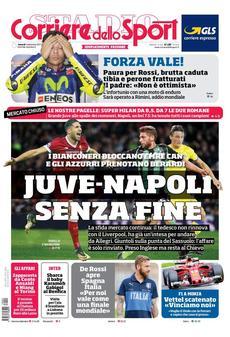 Prima pagina del Corriere dello Sport dedicata al testa a testa Juve-Napoli. I bianconeri hanno prenotato Emre Can dal Liverpool, i partenopei invece hanno opzionato Domenico Berardi del Sassuolo e preso, ma lasciato in prestito, Roberto Inglese del Chievo Verona. L’Inter in quest’ultima giornata di trattative accoglie l’attaccante franco-ivoriano e saluta Gabigol. Il brasiliano vola in Portogallo. Cessione in prestito al Benfica con diritto di riscatto fissato a 25 milioni. Si parla anche di una quota del 25% sulla futura rivendita a favore dell’Inter. Infine Zappacosta al Chelsea e Niang al Torino. E buonanotte al mercato che si risveglierà, ufficialmente, solo a gennaio.