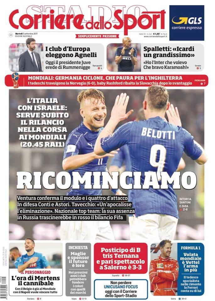 Il Corriere dello Sport apre parlando della nazionale italiana. Spazio anche a Spalletti, che definisce Icardi un grandissimo