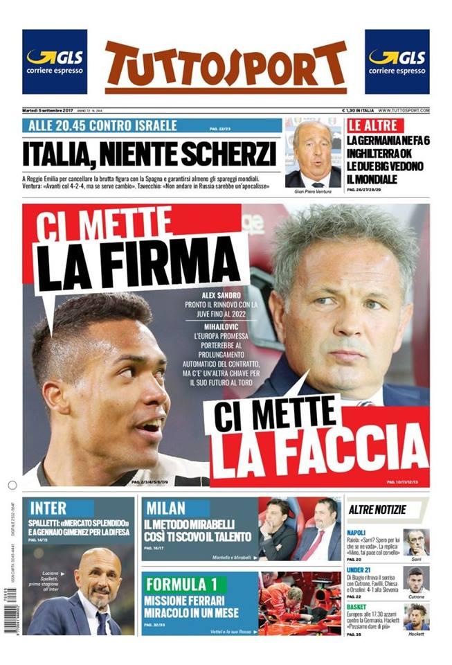 TuttoSport apre parlando del rinnovo di Alex Sandro e di Mihailovic che ha promesso l’Europa al Toro. Spazio anche alle parole di Spalletti sul mercato.