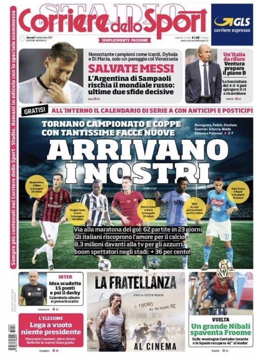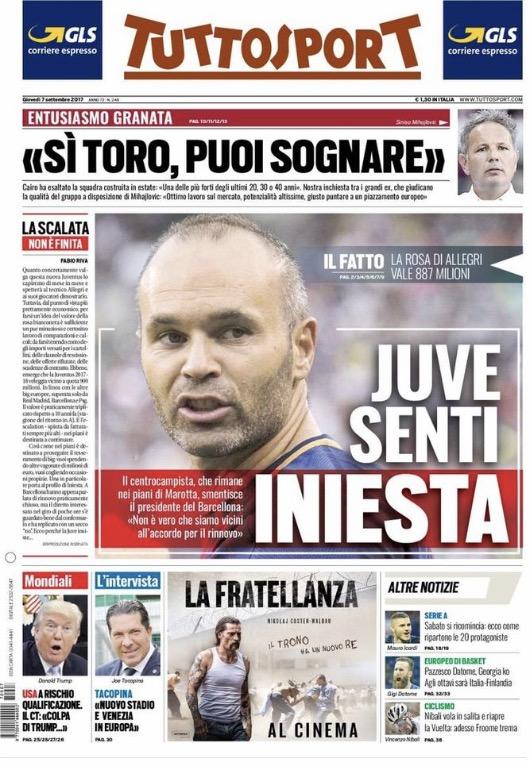 TuttoSport si concentra su Iniesta e la sua intervista dove afferma che l’accordo con il Barcellona per il rinnovo è ancora lontano. Sul Corriere dello Sport invece spazio all’Inter e al calendario