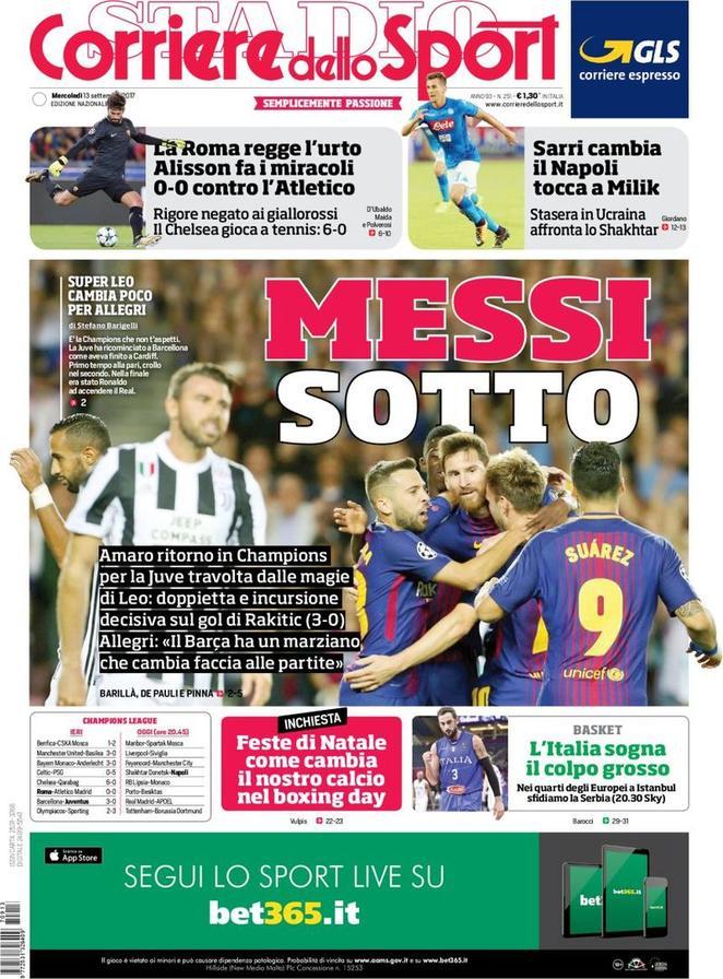 La prima pagina di Tuttosport dedica ai nerazzurri un trafiletto nel quale riporta l’intervista a Bruno Barbieri. Il giurato di Masterchef ed esperto di cucina ha fatto dei paragoni con l’Inter relativi al settore dolciario. Spalletti, comandante di questa squadra, sarebbe il Master. Icardi, invece, la più gustosa prelibatezza: un soufflé. Nessuna notizia sui nerazzurri, invece, nella prima pagina del Corriere dello Sport. L’attenzione è tutta sul big match del Camp Nou, quello in cui Messi ha ribadito, nel caso ci fosse dubbio, la sua superiorità non solo su Dybala, ma su gran parte del mondo calcistico. Il titolo è eloquente: “Messi sotto”.
