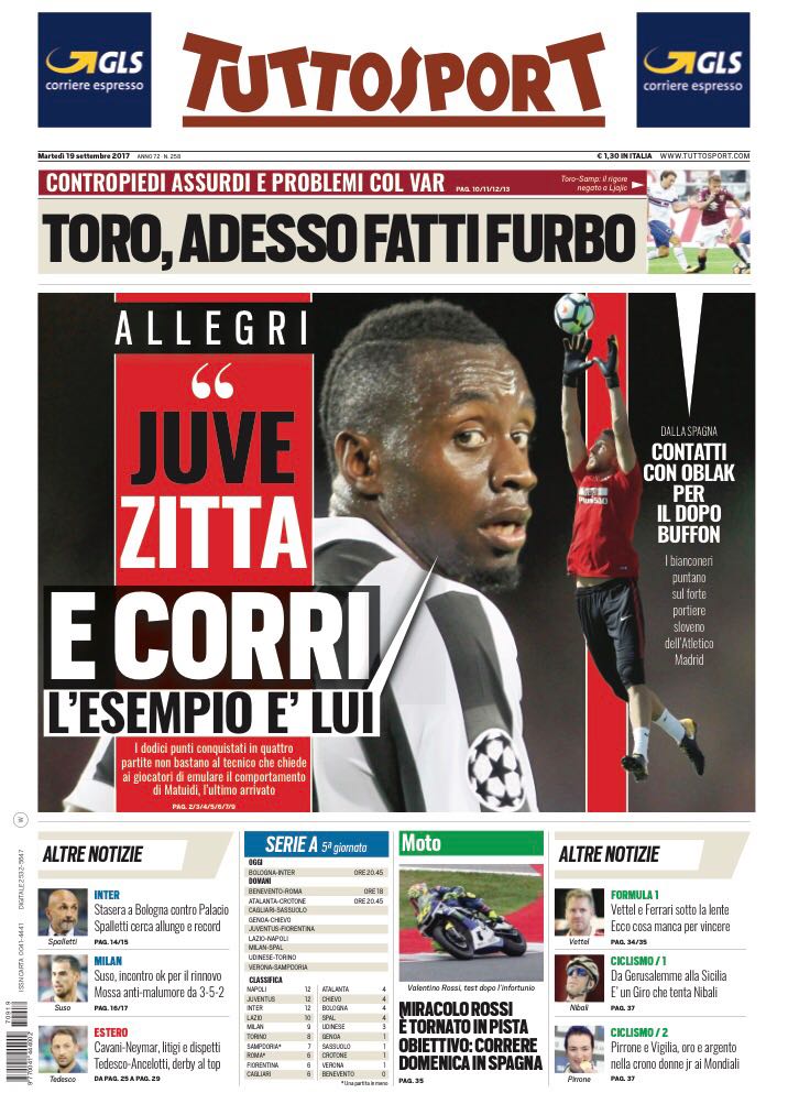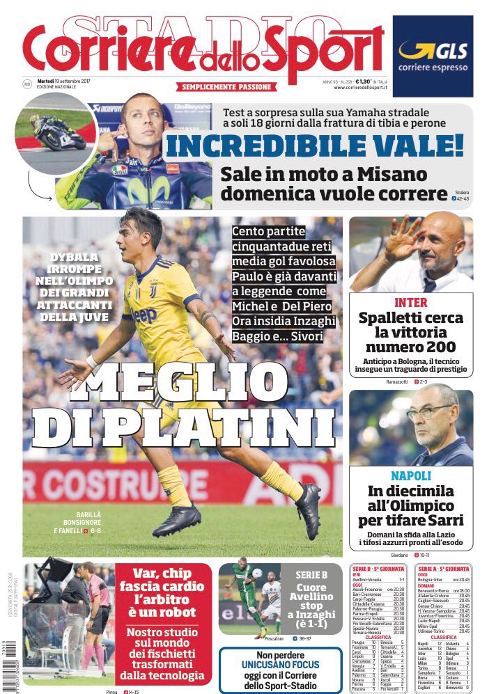 “Meglio di Platini”, questo il titolo sulla prima pagina del Corriere dello Sport che apre con Dybala ed i suoi numeri in bianconero. Di spalla spazio all’Inter (“Spalletti cerca la vittoria numero 200”) e al Napoli (“In diecimila all’Olimpico per tifare Sarri”). In basso si legge del Var e della Serie B con l’anticipo di ieri tra Avellino e Venezia. “Juve zitta e corri, l’esempio è lui”, così invece titola Tuttosport riprendendo le dichiarazioni di Allegri che si riferiva a Matuidi. In alto ecco i granata: “Toro, adesso fatti furbo”. In basso infine le milanesi ed il calcio estero.