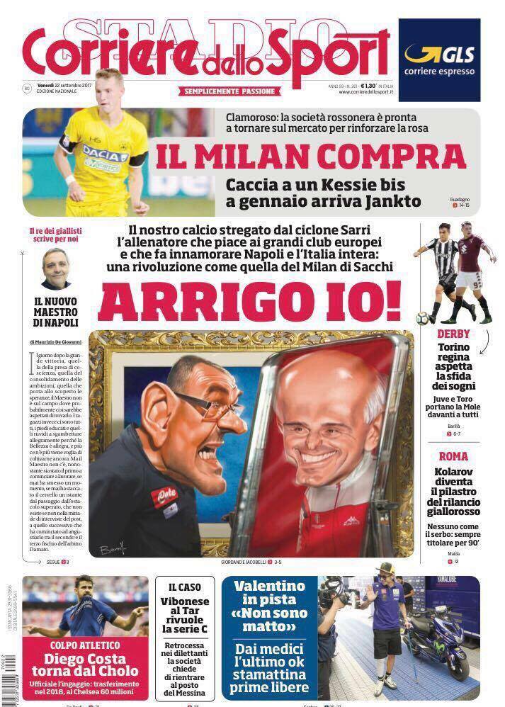 Il Corriere dello Sport dedica la prima pagina a due allenatori che sono considerati innovatori per la propria epoca: Maurizio Sarri ed Arrigo Sacchi. Nel taglio alto, l’interesse del Milan per Jankto.