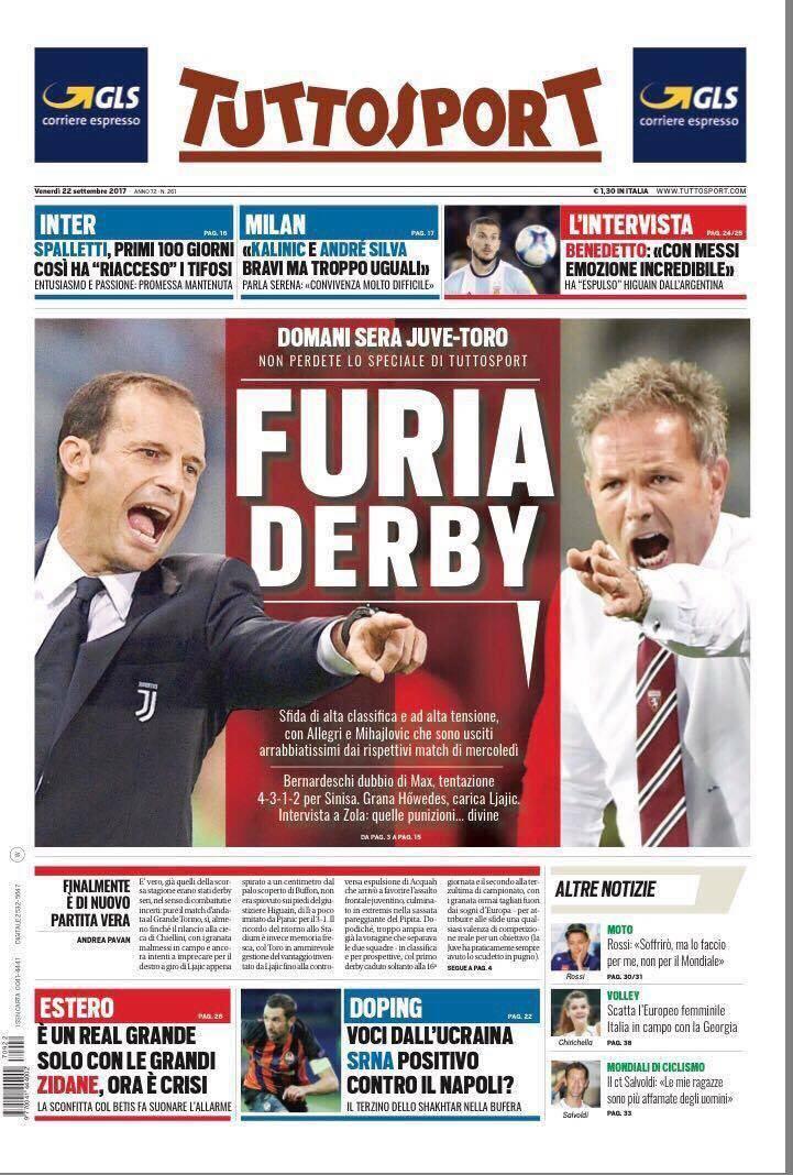Tuttosport invece riscalda gli animi per il derby allo Juventus Stadium di sabato sera (ore 20.45), con i due tecnici Allegri e Mihajlovic protagonisti.