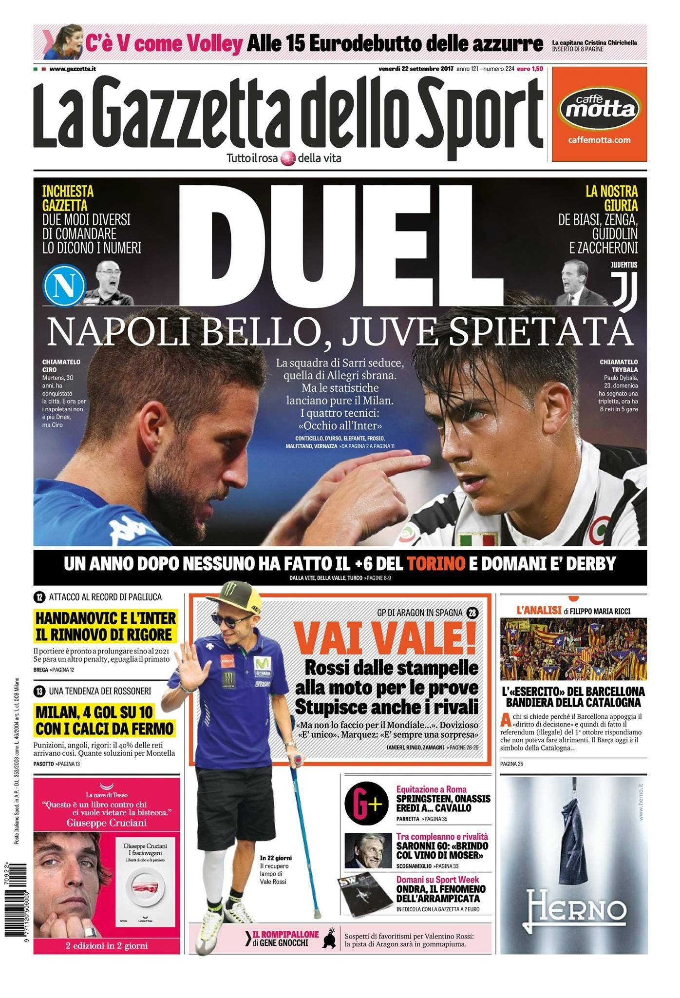 La Gazzetta dello Sport invece si fossilizza sullo scontro tra Napoli e Juventus in ottica scudetto.