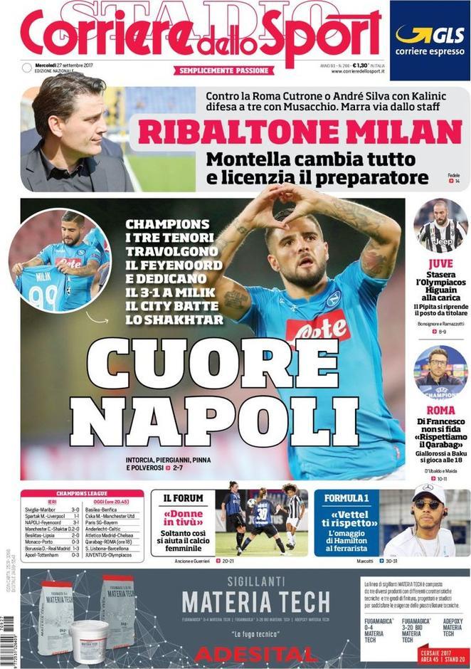 Il Corriere dello Sport omaggia il Napoli, che si è riscattato nel secondo turno di Champions,e al Milan che ha cambiato preparatore atletico dopo la sconfitta con la Samp.