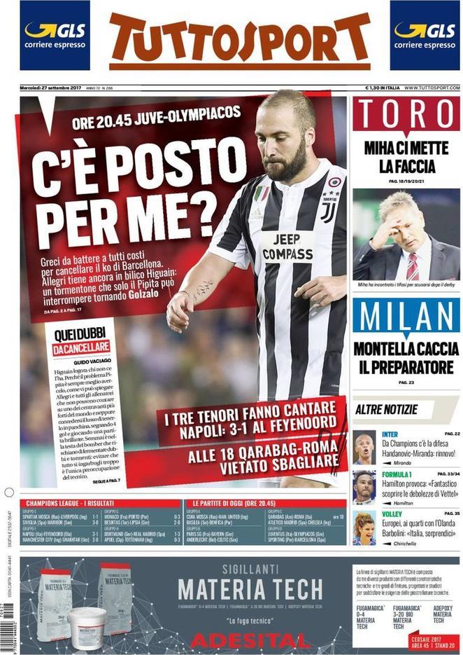 TuttoSport apre parlando come di consueto di Juventus, che potrebbe venire destabilizzata dal mini caso Higuain, pagato 94 milioni lo scorso anno e relegato in panchina in questo avvio di stagione. Spazio anche al Napoli, vittorioso contro il Feyenoord in Champions e all’Inter, che per ora ha una difesa da urlo.
