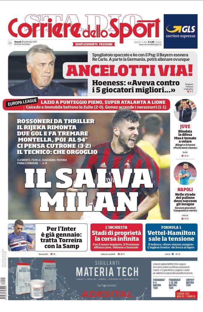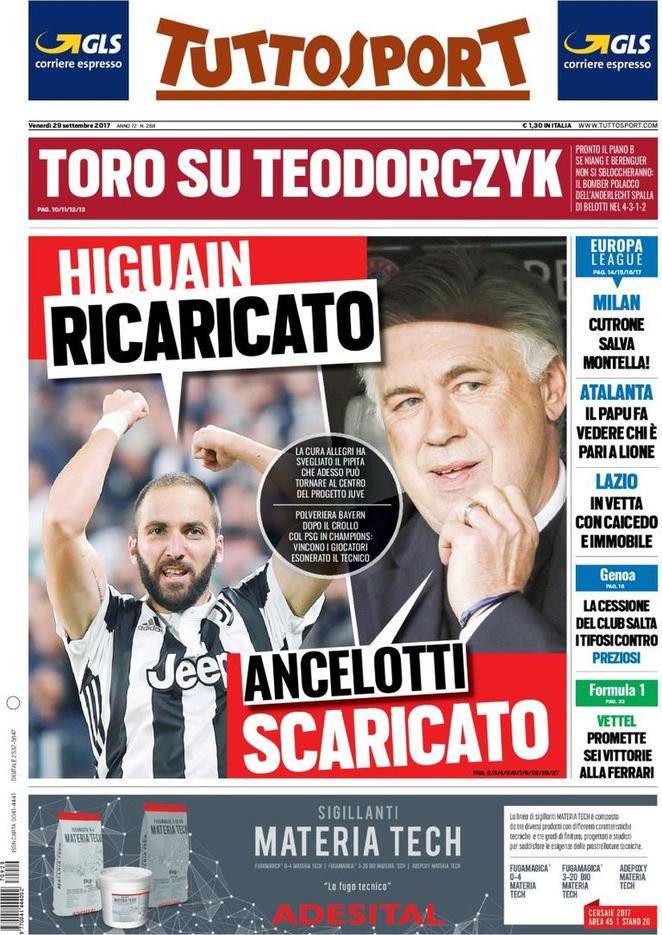 La prima pagina di TuttoSport si occupa di Higuain ricaricato e di Ancelotti scaricato, ovvero esonerato.