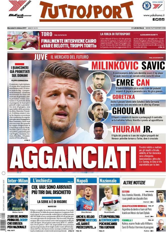 Tuttosport in prima pagina seleziona diversi centrocampisti come possibili nuovi arrivi della Juventus. Nel taglio basso invece, i viaggi che dovranno affrontare i calciatori di Inter e Milan nei due giorni di nazionale, in attesa del derby.