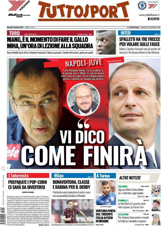 Tuttosport dedica la prima pagina al duello scudetto Juventus-Napoli, con Pierpaolo Marino pronto a dare la sua opinione su questo scontro al vertice. Spazio anche all’Inter, questa volta si parla delle soluzioni tattiche per Spalletti. Il tecnico toscano ha ben tre frecce da scoccare sulle fasce: Dalbert, Cancelo e Karamoh. Ma i tre esterni devono nettamente migliorare nella fase difensiva. Poi in casa Torino c’è il difficile problema del sostituire Belotti: sarà Niang a fare il Gallo. Bonaventura carica il Milan in vista del Derby e contro la Macedonia il ct Ventura punterà forte sul tridente.