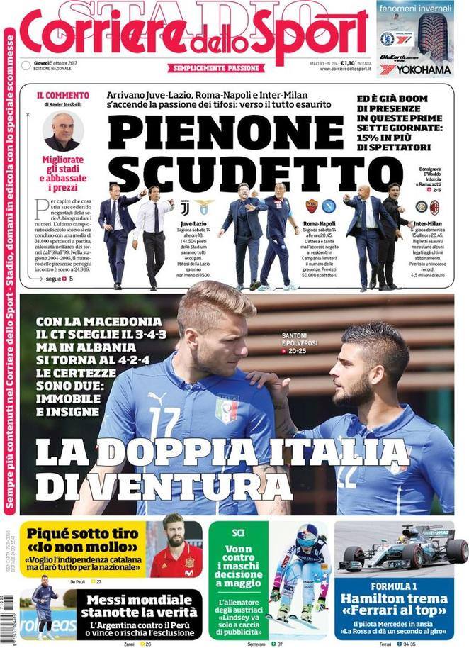 Prima pagina del Corriere dello Sport dedicata al boom di presenze negli stadi italiani: più 15% rispetto allo scorso anno e presto arriveranno tre sfide di cartello: Juve-Lazio, Roma-Napoli e il Derby di Milano tra Inter e Milan. Poi tutti i dubbi di Ventura per il match contro la Macedonia, solo due le certezze: Immobile ed Insigne. Piquè dichiara di non voller mollare nonostante le contestazioni per le sue posizioni indipendentiste bei confronti della Catalogna e Messi stanotte e chiamato a guidare l’Albiceleste. Gli argentini infatti si giocano la qualificazione mondiale stanotte contro il Perù.