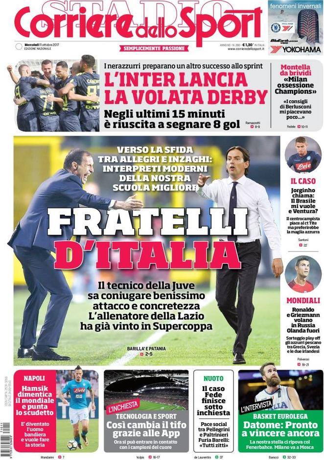 Il Corriere dello Sport apre parlando della prossima sfida fra Juventus e Lazio e dell’Inter, pronta a lanciare la volata derby.