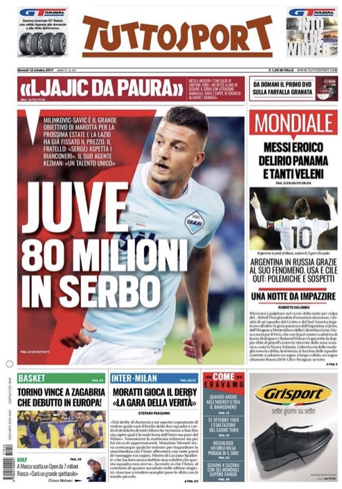 Il mercato protagonista su Tuttosport: “Juve, 80 milioni in serbo”, per i bianconeri è Milinkovic-Savic l’obiettivo per la prossima estate. In alto: “Ljajic da paura”, contro il Crotone il serbo è atteso ad un’altra prestazione da protagonista dopo i tre gol e tre assist messi a segno da inizio stagione.