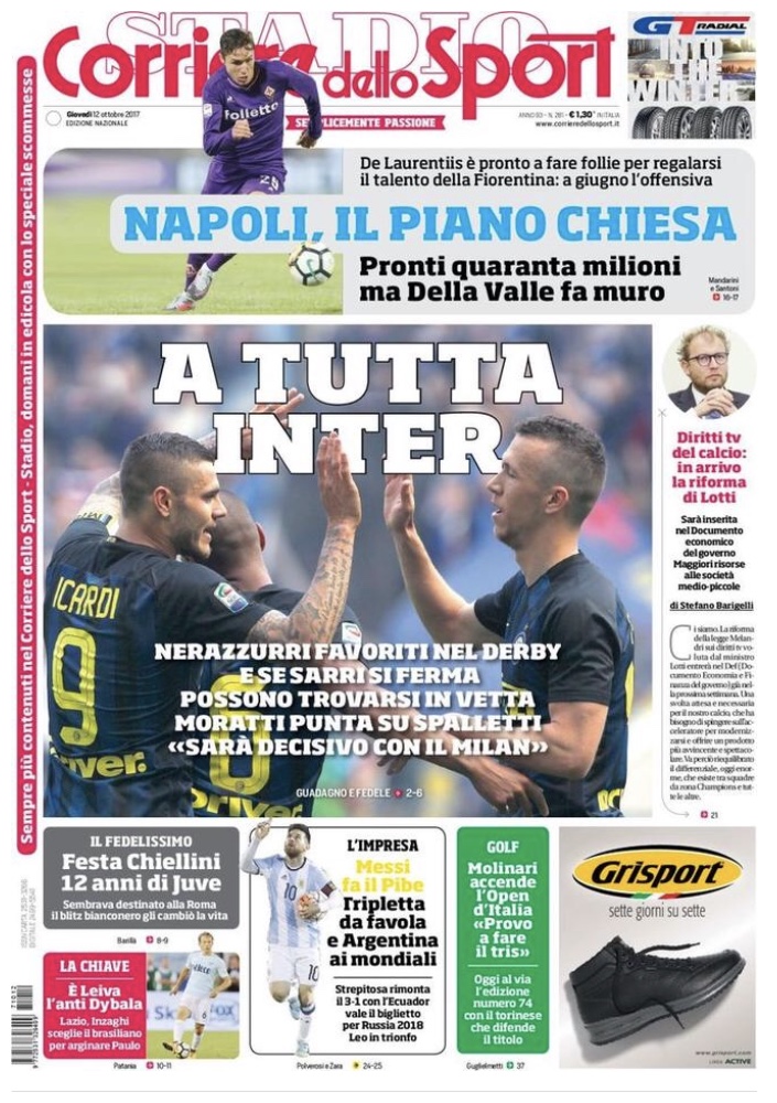 “A tutta Inter”, i nerazzurri per il Corriere dello Sport sono i favoriti nel derby di Milano e se il Napoli si ferma, possono ritrovarsi in vetta. In alto spazio al calciomercato con il Napoli che ha pronto un piano per raggiungere Chiesa, pronti quaranta milioni di euro per il giovane viola, ma Della Valle fa muro. In basso invece la sfida tra Juventus e Lazio, con chiellini che festeggia i 12 anni con la Juventus, mentre Inzaghi punta su Leiva per arginare Dybala.