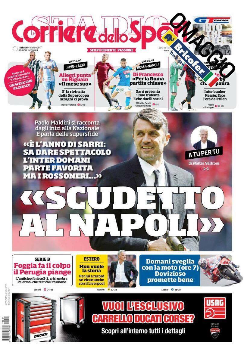 Prima pagina del Corriere dello Sport dedicata a Paolo Maldini e alla sua intervista. Il campione ex Milan è sicuro: lo scudetto al Napoli. A proposito di rossoneri: l’ex capitano li da come sfavoriti ma occhio alle sorprese. Sempre a tema derby ecco l’analisi: l’Inter è un bunker mentre è arrivata l’ora dei cugini. Roma-Napoli partita chiave per Di Francesco mentre Sarri lucida il suo tridente delle meraviglie. Allegri punta tutto sul Pipita Higuain: sarà il mese dell’argentino. Infine colpo Foggia contro il Perugia, l’anticipo di B termina 2-1.