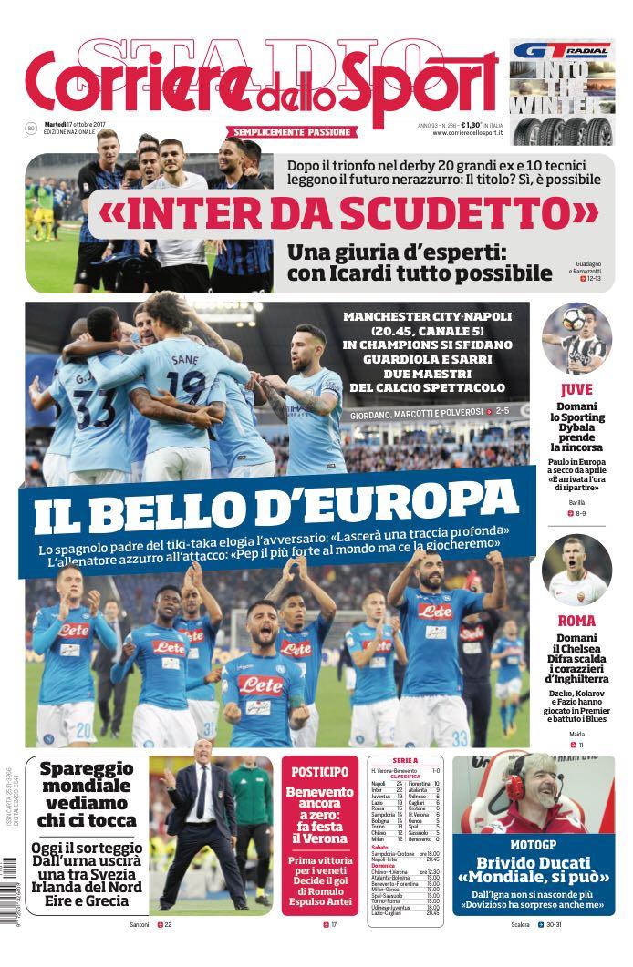 Se a Torino si sono dimenticati dello straordinario derby di domenica a Roma è successo l’opposto. 30 esperti sono stati interrogati sulle possibilità nerazzurre di vincere lo scudetto è il parere è quasi un plebiscito: l’Inter può ambire al trofeo nazionale più prestigioso. Spazio poi al Napoli, chiamato ad affrontare il City in Champions. Sfida che vedrà opporsi i due migliori giochi d’Europa, per la gioia degli amanti del bel calcio. Spazio anche a Roma e Juventus chiamate agli esami Chelsea e Sporting Lisbona. Infine anche qui spazio ai sorteggi mondiali, l’Italia conoscerà il proprio destino.
