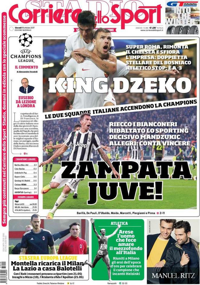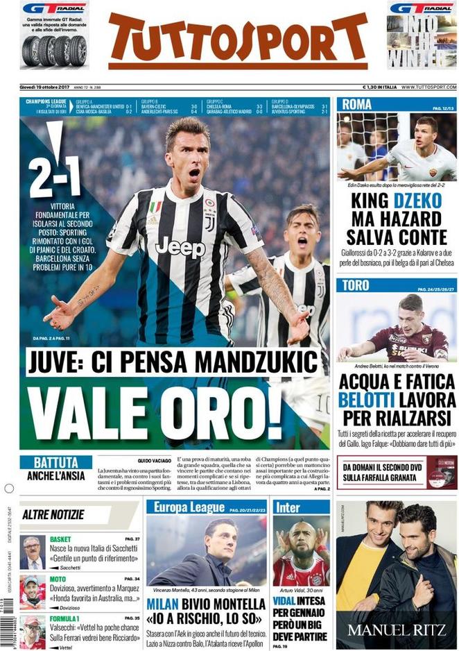 È stata una serata di Champions difficile ma tutto sommato positiva per le due italiane. Questa è la notizia principale che si trova nella prima pagina di TuttoSport, soprattutto dal punto di vista bianconero; attenzione dello stello livello invece per la Roma sul Corriere dello Sport. Non viene però tralasciato il mercato, argomento sempre fresco di aggiornamenti. L’ultima novità riguarda Vidal e l’Inter; il cileno può arrivare a gennaio, ma ci sarebbe bisogno della cessione di un big. Sarebbe però un grande colpo, di prestigio; e rinforzerebbe un reparto che necessita di un top player.