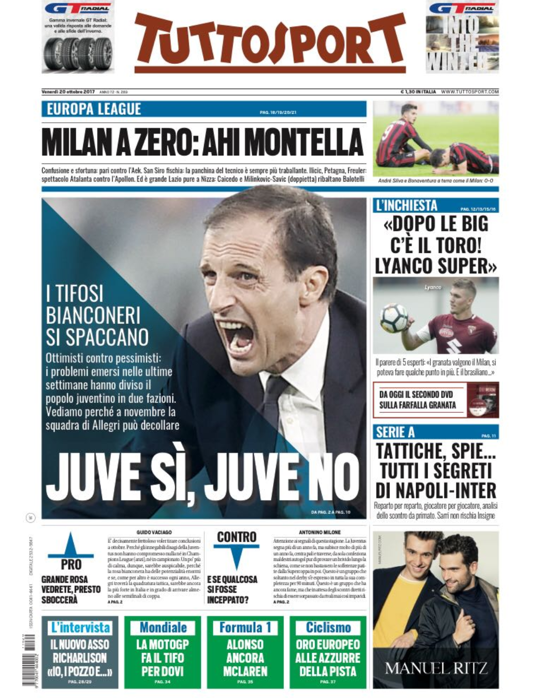 Anche nella prima pagina di Tuttosport c’è spazio per un focus sul big match della prossima giornata di campionato tra Napoli e Inter: “Tattiche, spie… tutti i segreti di Napoli-Inter. Reparto per reparto, giocatore per giocatore, analisi dello scontro da primato. Sarri non rischia Insigne”.
