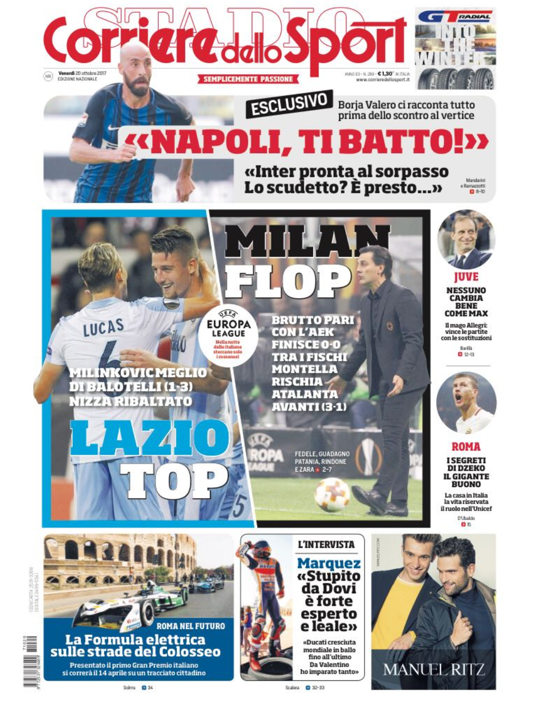 Consueto appuntamento con la rassegna stampa di SpazioInter. Domani in edicola ci sarà Borja Valero, tra i protagonisti della prima pagina del Corriere dello Sport. Lo spagnolo parla in vista del Napoli, prossimo avversario in campionato dell’Inter di Spalletti, parlando in un’intervista esclusiva.