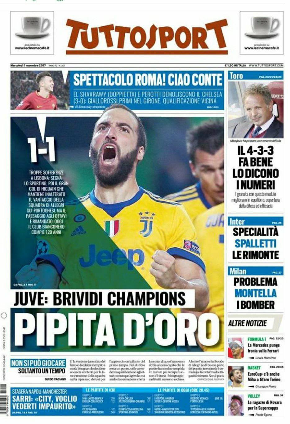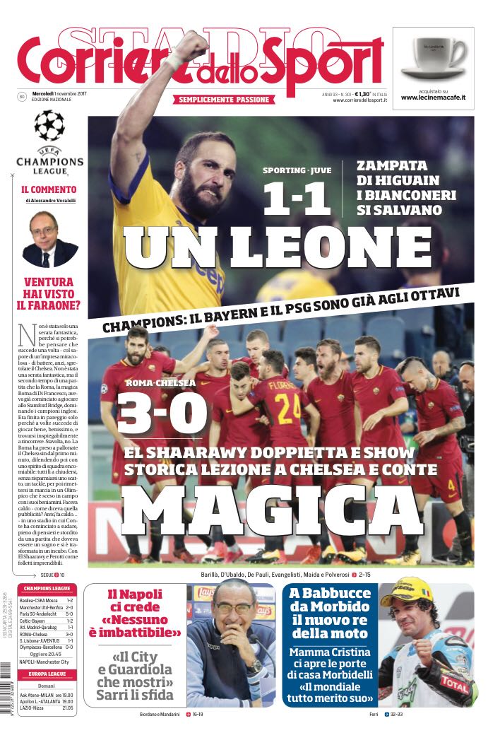 TuttoSport apre la prima pagina in una notte calda di Champions, nella quale si vede una Roma strabiliante asfaltare il Chelsea di Conte. Solo un pareggio per la Juve. Per quanto riguarda la nostra amata Inter, Tuttosport apre con il titolo “Spalletti specialità rimonte”. L’Inter che vince e segna record su record ma che, ancora, non convince a pieno sul piano del gioco. Luciano Spalletti ha ancora tanto da lavorare. Il Corriere dello Sport non tratta invece temi riguardanti l’Inter.