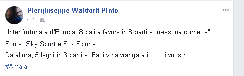 Come detto in apertura era il 4 ottobre, esattamente un mese fa, quando su Facebook compariva la statistica qui sopra. 6 pali a favore per i nerazzurri e le maggiori testate sportive nazionali iniziarono a snoccialare dati su quanto fosse fortunata l’Inter e che l’ottimo avvio di stagione dipendesse in gran parte da tutto questo. Addirittura Mediaset Premium stilò la classifica europea dei pali a favore e con grande rammarico si scoprì che i nerazzurri erano secondi dietro i francesi del Saint Etienne. Nei 31 giorni trascorsi dalla pubblicazione di questa statistica l’Inter ha collezionato 5 pali in 3 partite ma questo non l’ha detto nessuno.