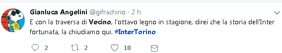 Come detto nell’ultimo mese sono stati 5 i legni collezionati in sole 3 partite, mentre se si fa la somma dei legni colpiti da inizio stagione si arriva a ben 8 in 12 partite. Solo la Roma ne ha raccolti di più 11, di cui 3 nel big match contro i nerazzurri e per i quali i tifosi giallorossi recriminano ancora. Come detto 8 pali colpiti in 12 partite, un numero enorme ma che a differenza dei pali a favore tanto recriminati non meritano di essere ricordati. Ora che l’Inter non è più la squadra più “fortunata” del campionato le statistiche sui legni a favore/sfavore sono sparite. Non vorremmo certo dubitare della buona fede degli organi di stampa ma come diceva il detto: “a pensare male si fa peccato, ma spesso ci si azzecca”.