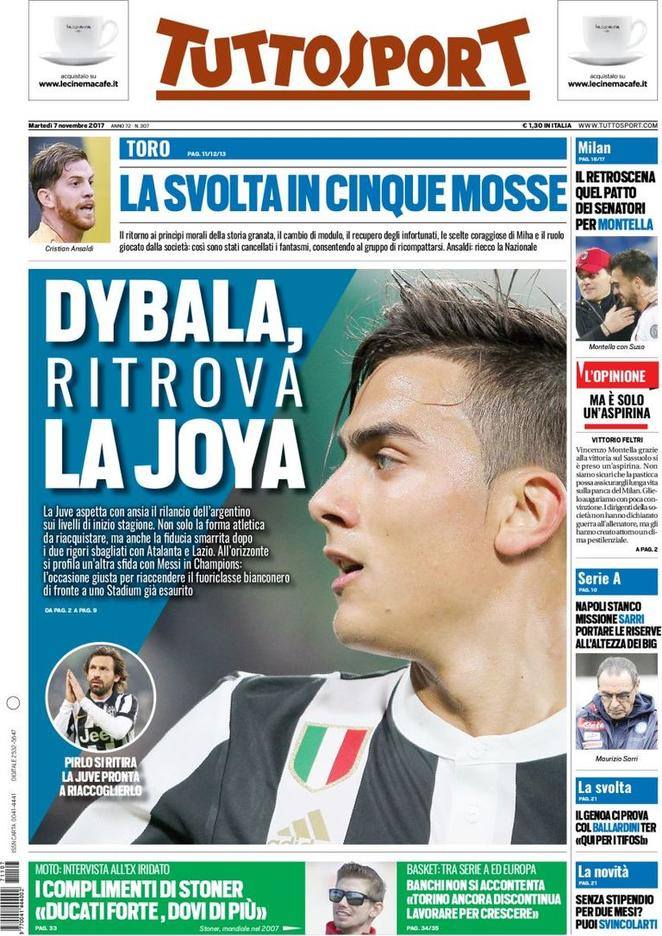 Prima pagina di Tuttosport come sempre dedicata alla Juventus. Protagonista l’attaccante argentino un po’ appannato rispetto all’inizio di stagione. Ora per il 10 bianconero è tornato il momento di essere protagonista. Il torino ha svoltato e il segreto sono le 5 mosse di Mihajlovic, questo è quanto dichiara il quotidiano torinese. Patto tra i senatori del Milan per salvare Montella. Il Napoli è stanco e ora Sarri deve trasformare le riserve in big. Infine Genoa: esonerato Juric le speranze salvezza del grifone sono legate a Ballardini. Nessuna menzione invece in prima pagina per i nerazzurri.