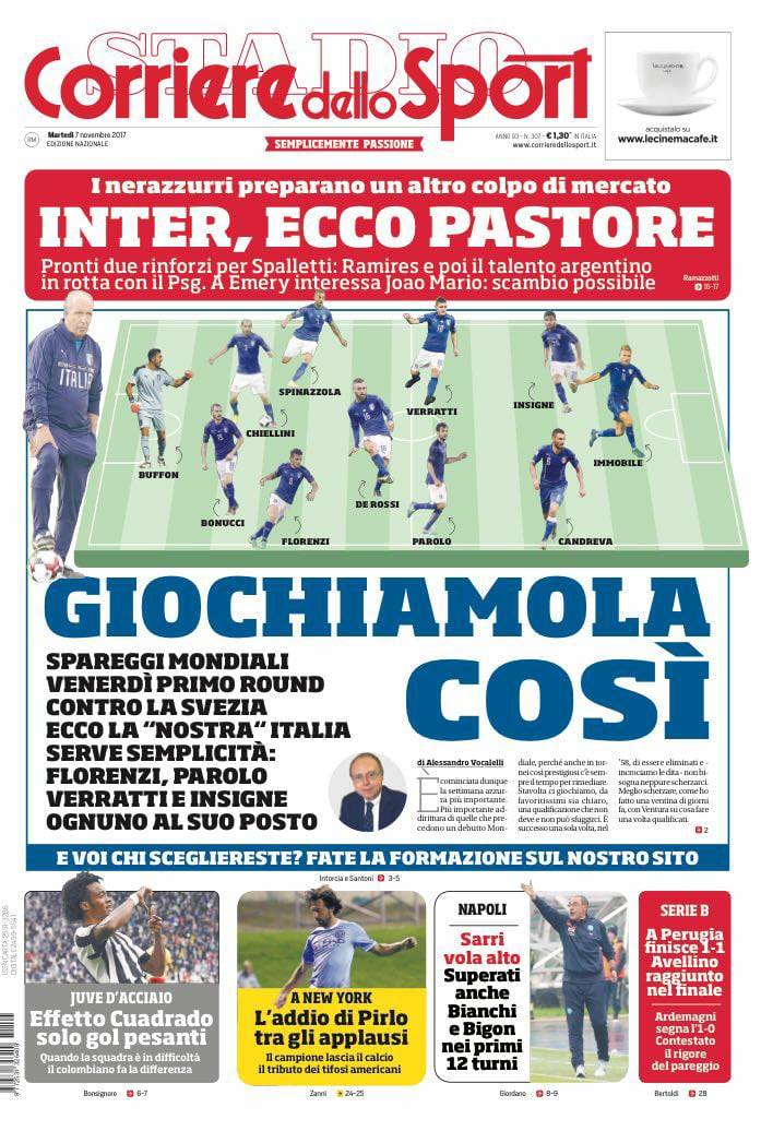 Prima pagina del Corriere dello Sport che titola di un assalto nerazzurro al talento argentino ormai ai margini del progetto del Psg. Insieme a lui arriverebbe Ramires dal club gemello dello Jiangsu Suning. Spareggi mondiali: il quotidiano propone la propria formazione dell’Italia in vista del play off di venerdì contro la Svezia. Effetto Cuadrado, per la Juventus ci pensa il colombiano a segnare gol pesanti. Infine l’addio al calcio di Andrea Pirlo, il maestro ex Inter ha giocato quest’oggi la sua ultima partita con la maglia dei New York City.