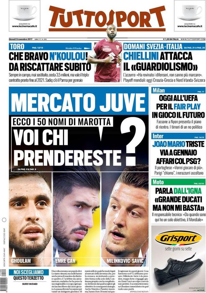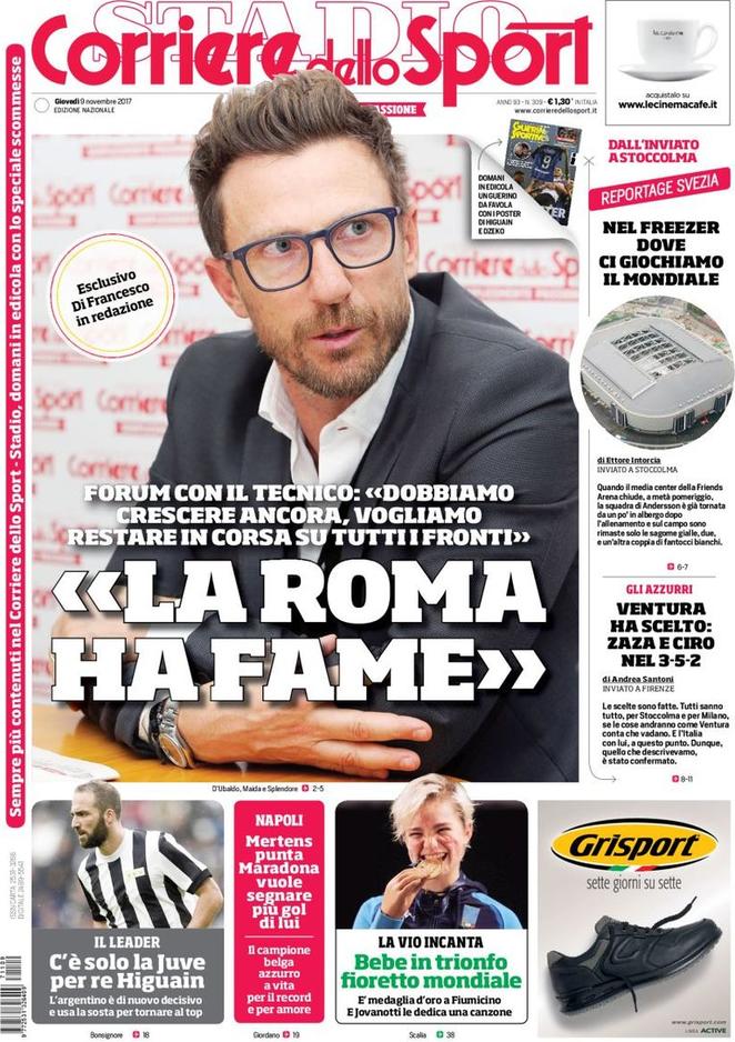 Nella prima pagina di Tuttosport c’è spazio anche per l’Inter. Agli onori della cronaca balza la vicenda Joao Mario. Il centrocampista, dal ritiro del Portogallo, ha pronunciato parole che sanno di addio. “Voglio valutare la mia situazione, potrei giocare altrove”. A questo punto, non è da escludere un passaggio già nella finestra invernale al Paris Saint Germain. Il club francese ha già mostrato il suo interesse nei confronti dell’ex Sporting Lisbona. L’asse Milano-Parigi è caldo, e non è detto che sul piatto, magari come contropartita, non spuntino altri giocatori come Lucas e Pastore. Nessuna notizia sui nerazzurri, invece, nella prima pagina del Corriere dello Sport. A dominare, l’intervista ad Eusebio Di Francesco, che si fa portavoce della fame di vittorie della Roma.