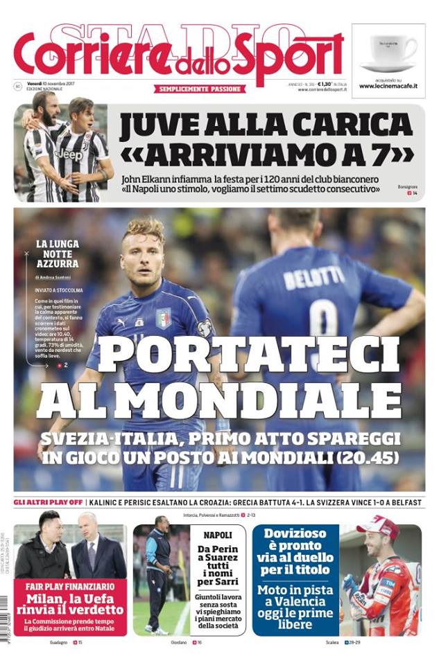 Il Corriere dello Sport apre parlando chiaramente dello spareggio mondiale che vedrà protagonista l’Italia di Ventura. impegnata questa sera nell’andata contro la Svezia. Spazio anche alla Juventus, la cui dirigenza vuole il settimo scudetto consecutivo e al Milan, che non ha ancora certezze riguardo il verdetto della Uefa sul proprio bilancio.