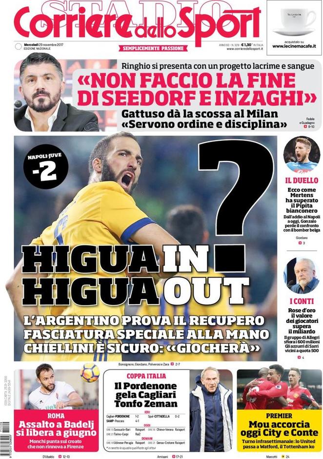 Il Corriere dello Sport apre invece parlando del grande dubbio per la partita di venerdì: la presenza dell’ex, Higuain, che continua a essere in forse. Anche qui spazio per le dichiarazioni nella prima conferenza di Gattuso e per l’impresa del Pordenone, prossimo avversario in Coppa Italia per l’Inter.
