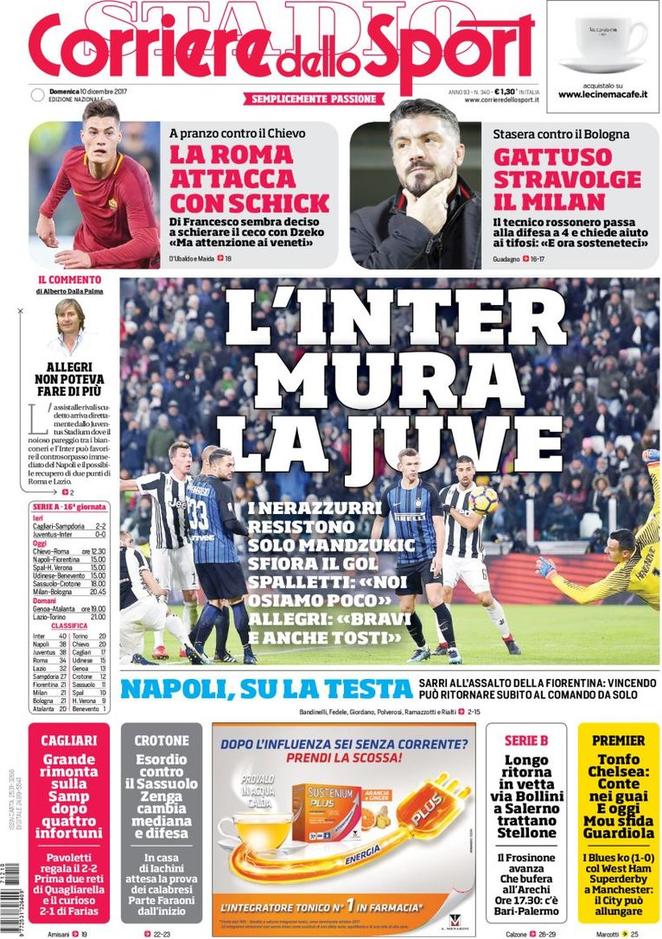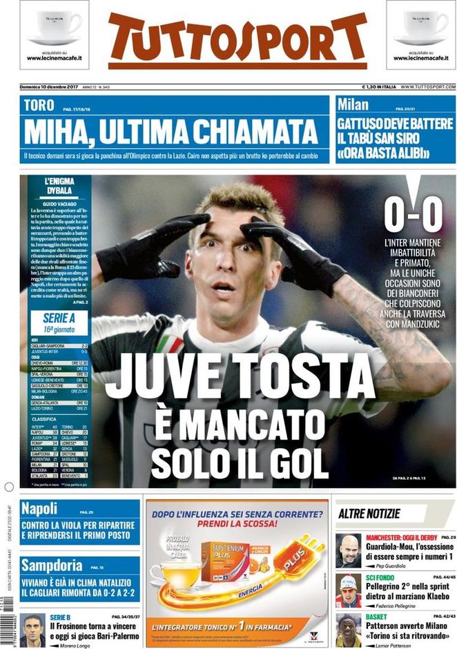 Archiviato il derby d’Italia, diamo uno sguardo alle prime pagine dei maggiori quotidiani sportivi nazionali. Ritorna il solito appuntamento con la rassegna stampa firmata SpazioInter. Iniziamo da Tuttosport: la prima pagina del quotidiano torinese presenta Mario Mandzukic in copertina, sottolineando come ai bianconeri, nel match contro l’Inter terminato 0-0, sia mancato solo il gol. Il Corriere dello Sport invece sottolinea la capacità dell’Inter di frenare la Juventus, evitando così di capitolare sotto i colpi dei bianconeri.