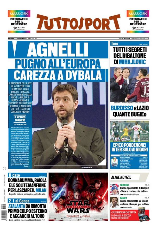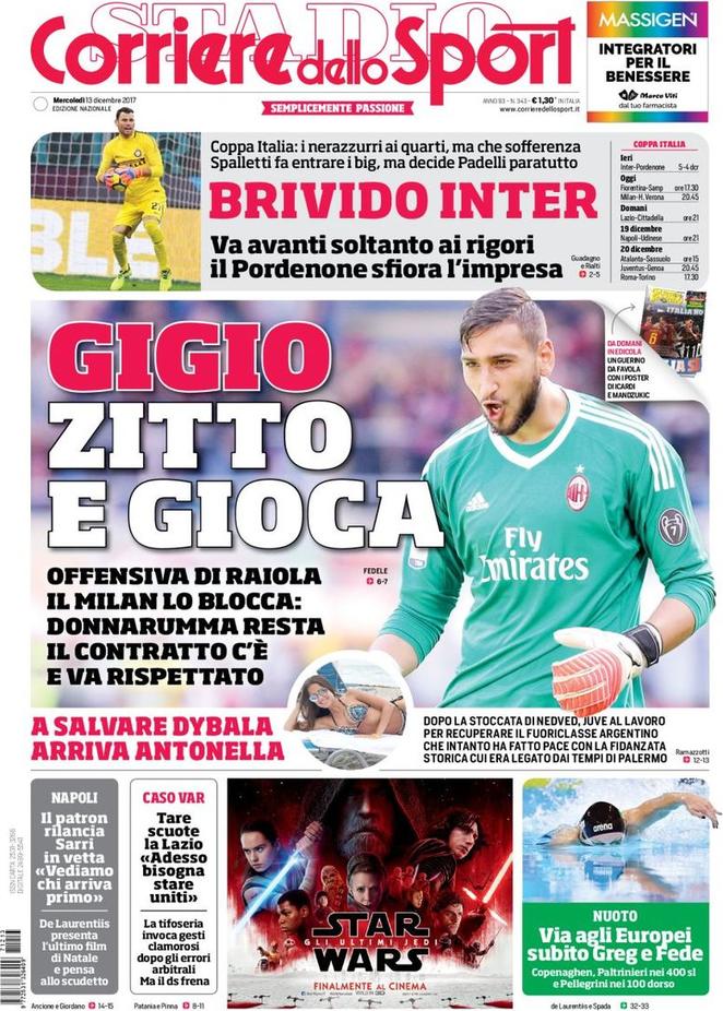 Per sfortuna dei nerazzurri è proprio la loro partita al centro dell’attenzione dei giornali di oggi. D’altronde, nessuno poteva aspettarsi tale partita, forse nemmeno i più positivi tra i tifosi del Pordenone. Nonostante si trattasse di una squadra che milita in Serie C, l’Inter ha avuto tantissime difficoltà; ci sono state numerose occasioni, è vero, ma anche gli avversari ne hanno avute. Il match si è deciso sorprendentemente solo ai rigori, grazie all’uomo che non ti aspetti, Nagatomo. Naturalmente, i giornali sottolineano la difficoltà impiegata dei nerazzurri per superare una squadra più che abbordabile. Ecco dunque le prime pagine di TuttoSport e Corriere dello Sport: